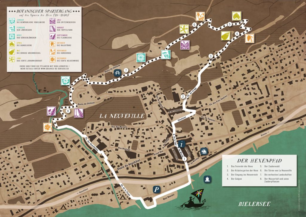 Der Plan hilft dir, den Weg der Hexe in La Neuveville zu verfolgen und die 12 Orte zu finden, an denen die beschriebenen Wildpflanzen anzutreffen sind. Das Karten-Lernspiel und die Hexe ermöglichen dir, die 12 Wildpflanzen im Laufe der Jahreszeiten aufzuspüren.